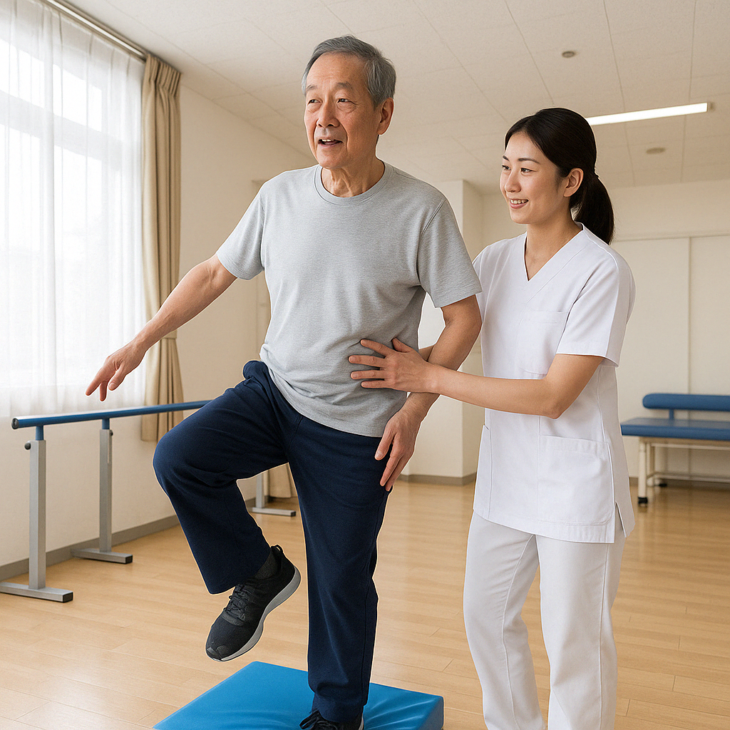 片脚立ちやステップ運動は前庭機能と固有受容感覚を刺激し、転倒リスクを低減します。リハビリ科にて個別プログラムを作成可能です。