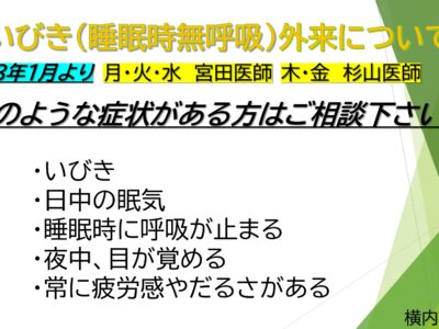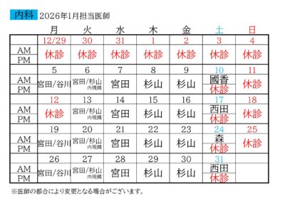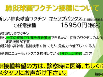 お知らせ Information HOME お知らせ 令和8年1月より いびき外来 木・金も診療致します 2025年12月17日 NEW 新しい肺炎球菌ワクチン キャップバックス接種のお知らせ 2025年12月16日 1月の担当医師カレンダーを更新致しました 2025年12月15日 【11月新設】禁煙外来のご案内 2025年11月17日 12月の担当医師カレンダーを更新致しました 2025年11月13日 11月の担当医師カレンダーを更新致しました 2025年10月16日 横内中央医院 LINE公式アカウント開設のお知らせ 2025年9月19日 10月の担当医師カレンダーを更新致しました 2025年9月9日 令和7年度 インフルエンザ予防接種・新型コロナワクチン定期接種について 2025年9月3日 外科 診療体制変更のお知らせ 2025年8月13日 9月の担当医師カレンダーを更新致しました 2025年8月13日 【動脈硬化を早期発見】ABI/PWV検査で血管年齢をチェック|横内中央医院 2025年7月30日 1 2 … 4 »