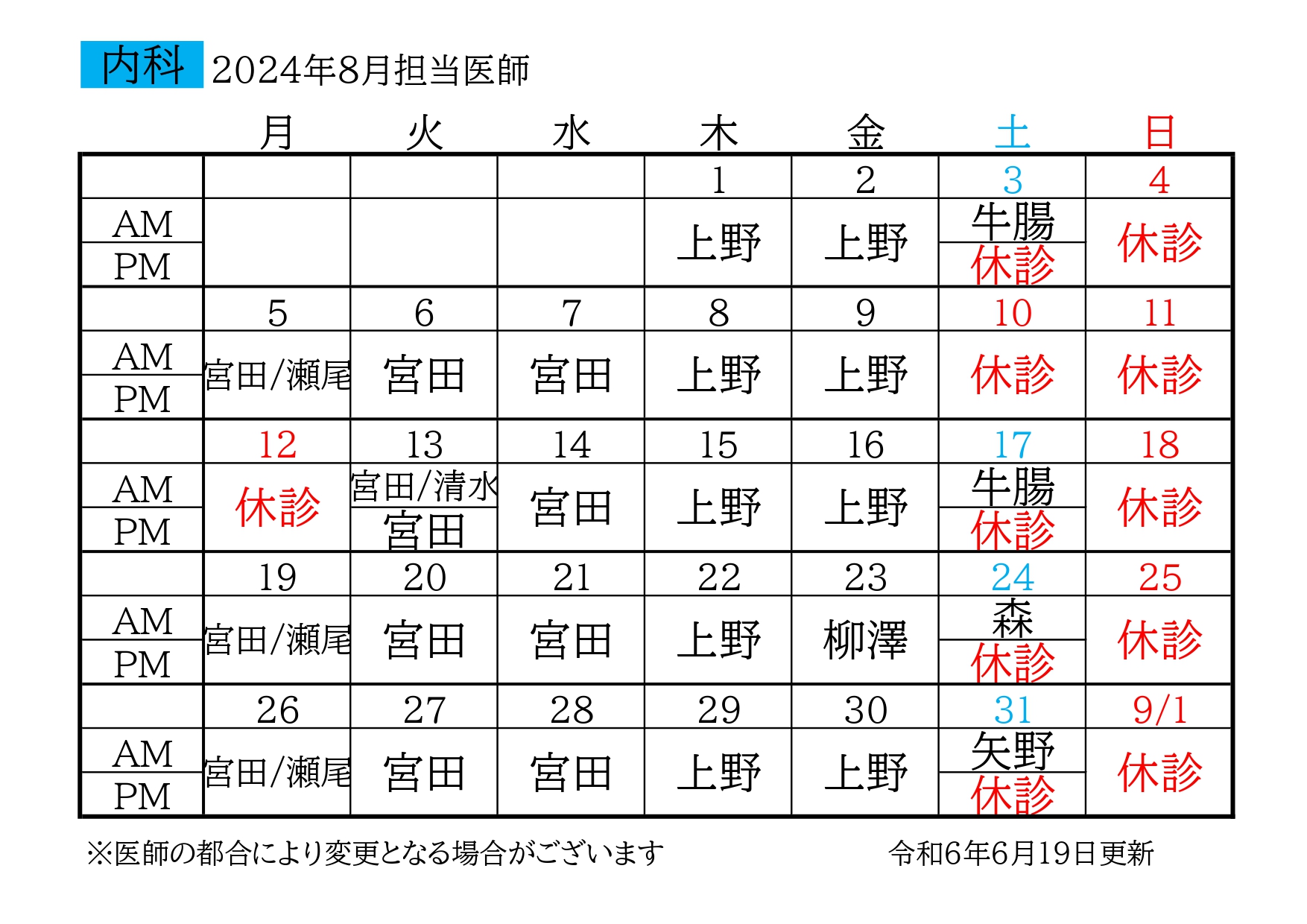 お知らせ Information HOME お知らせ 8月の担当カレンダーを更新しました お知らせ 8月の担当カレンダーを更新しました 2024年7月5日 【新しいページへ】 【過去のページへ】 一覧に戻る