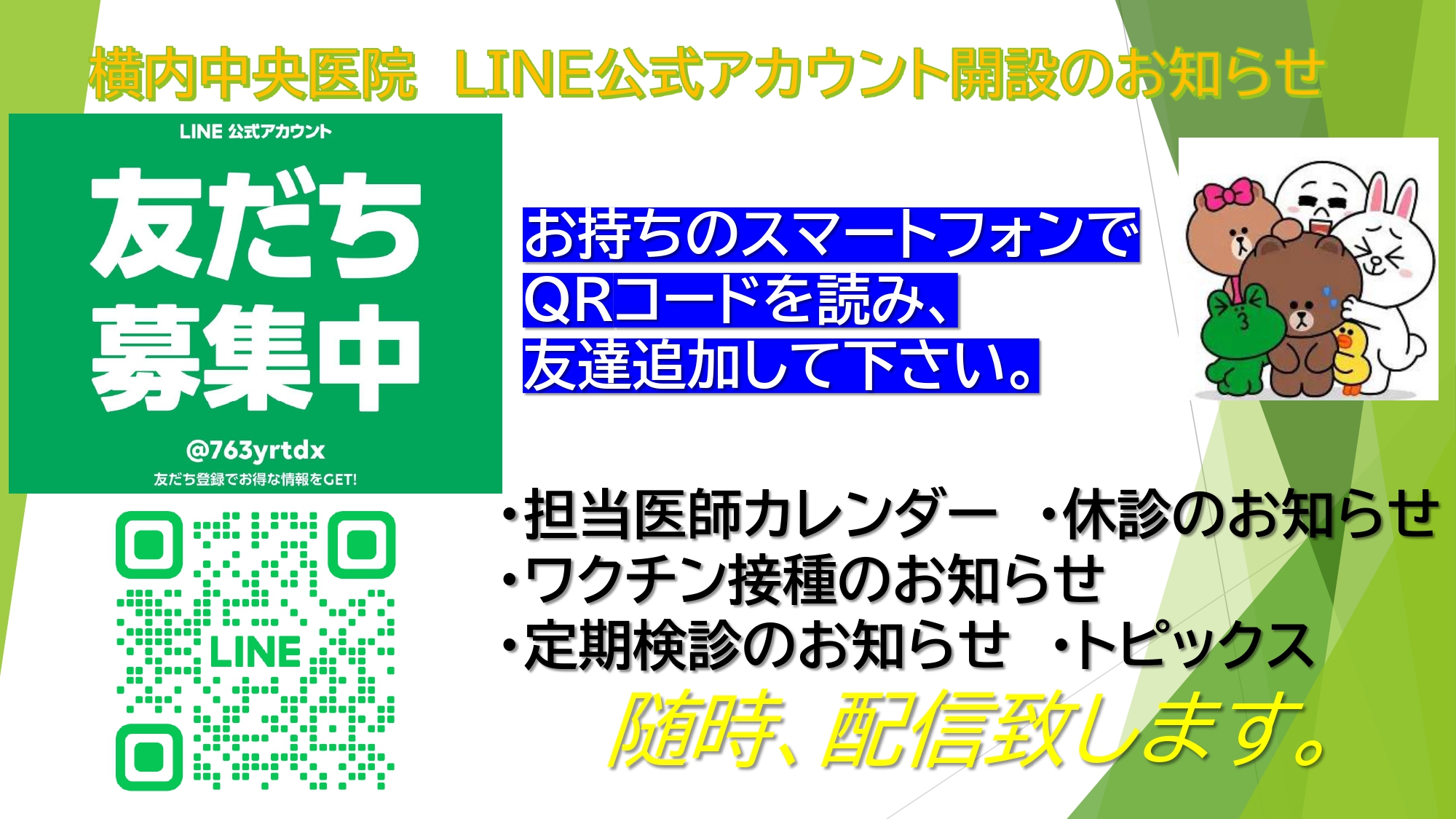 お知らせ Information HOME お知らせ 横内中央医院 LINE公式アカウント開設のお知らせ お知らせ 横内中央医院 LINE公式アカウント開設のお知らせ 2025年9月19日 【新しいページへ】 【過去のページへ】 一覧に戻る