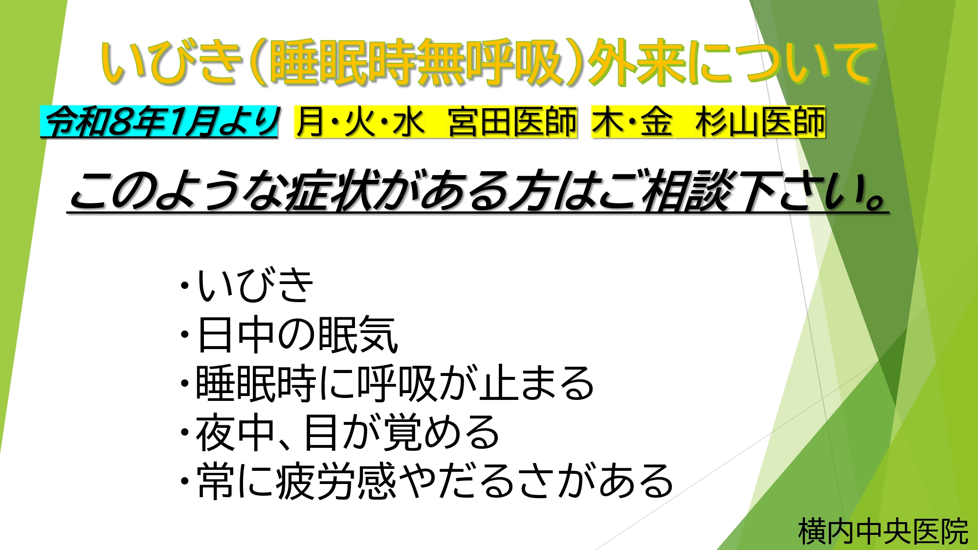 お知らせ Information HOME お知らせ 令和8年1月より いびき外来 木・金も診療致します お知らせ 令和8年1月より いびき外来 木・金も診療致します 2025年12月17日 【新しいページへ】 【過去のページへ】 一覧に戻る