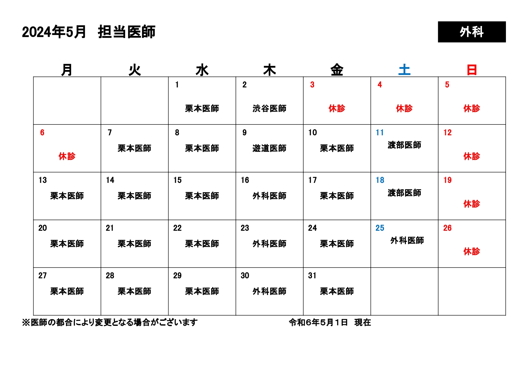お知らせ Information HOME お知らせ 5月の診療カレンダーを更新しました。 お知らせ 5月の診療カレンダーを更新しました。 2024年5月2日 【新しいページへ】 【過去のページへ】 一覧に戻る